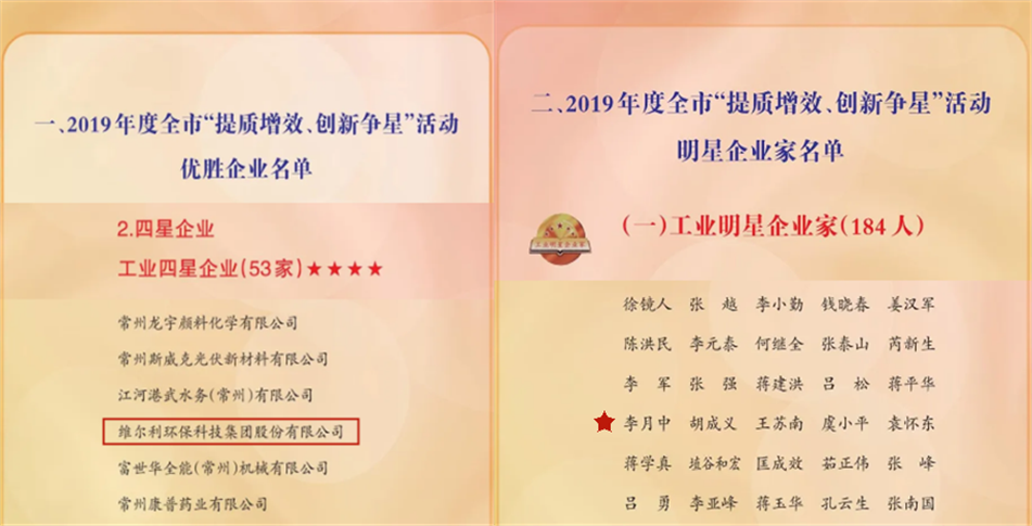 2020年3月10日,在常州市委、市政府召开的全市“重大项目强化攻坚年”动员大会上,PA视讯平台环保集团荣获2019年度常州市“工业四星企业”称号,董事长李月中先生被授予2019年度常州市“工业明星企业家”荣誉称号。这次评选结果为PA视讯平台环保集团成绩斐然的2019年画上了圆满的句号,更为2020年的发展绘下美好的开篇。