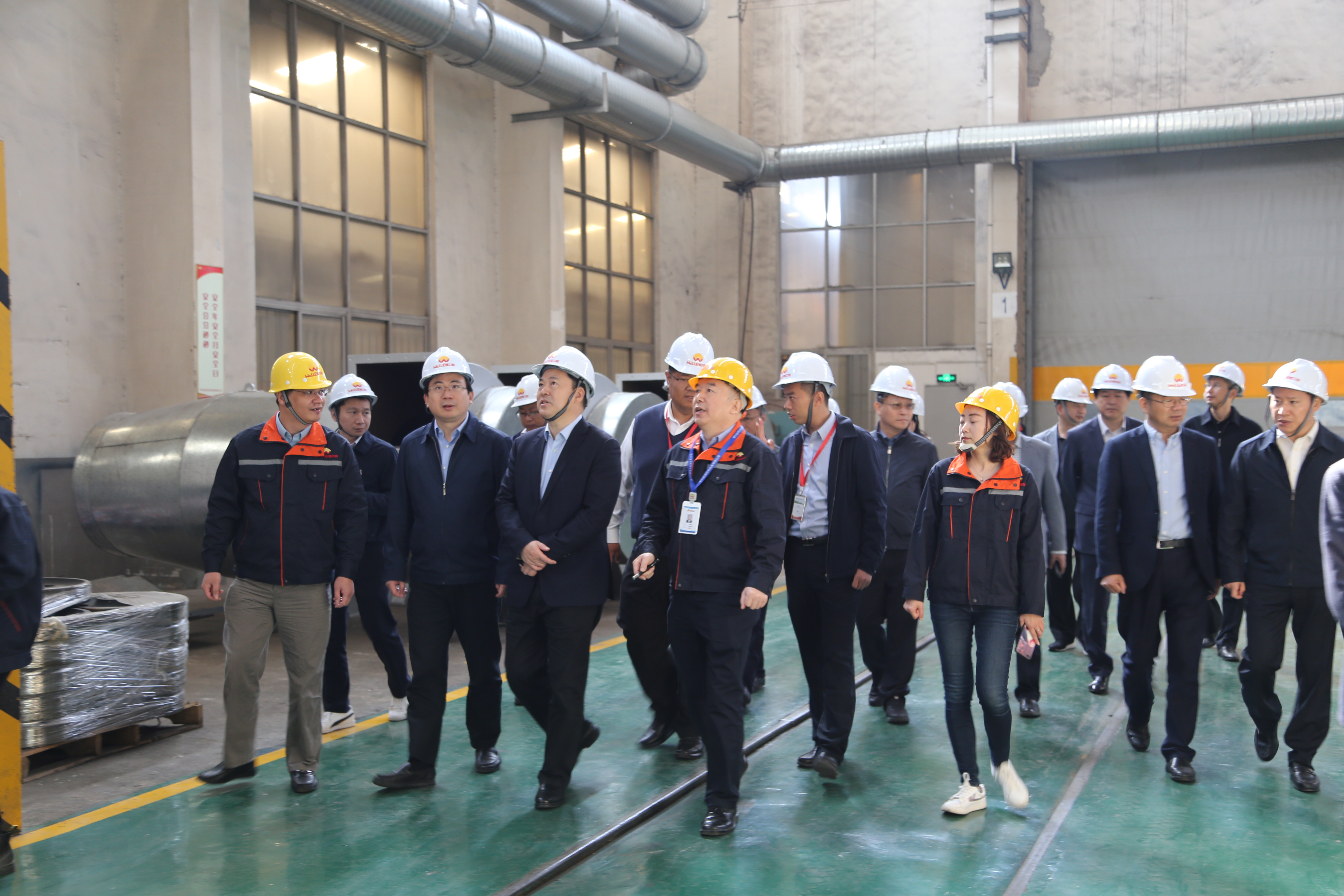 常燕青董事长向市领导介绍了金源机械在环保、节能等领域的发展情况。2017年公司投入500多万元对油漆车间进行彻底改造,VOCs排放情况得到了明显改善。2018年投入300多万元在所有焊接工位及火焰切割口安装了焊接烟尘收集管。经过近6个月的改造,所有焊接工位、割台烟尘均达标排放。2018年,公司荣获“滨开区环保综合整治提升奖”。2019年,公司投入200多万元对油漆房无组织VOCs收集进一步提升整治,无组织气体得到了有效收集并达标排放。今年,又加装了整套活性炭吸附系统,确保了油漆暂存库和危废仓库VOCs有组织排放。